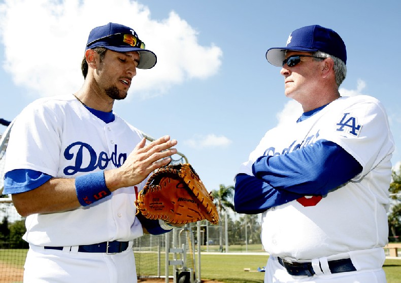 Nomar_and_grady Nomar Garciaparra also worked out at first base, which was great to see. As you might have read in the L.A. Times, he came down to Dodger Stadium earlier this month to work out with Eddie Murray and get a jump on Spring Training. That really impressed a lot of people around here – just the fact that he wanted to see what it was like to play the position at Dodger Stadium, knowing that he wouldn’t be able to simulate game action at Chavez Ravine while he was at Dodgertown. In the photo, he and Grady Little got a chance to catch up out on one of the fields here after the drills were done.