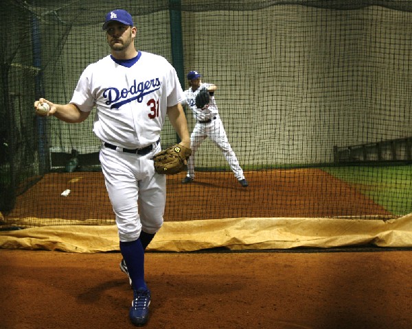 It was another rainy day here at Dodgertown, forcing the workouts indoors. Several players, including Eric Gagne, Derek Lowe (pictured) and Brad Penny threw bullpen sessions inside the batting cages, while other players took batting practice before departing early.
