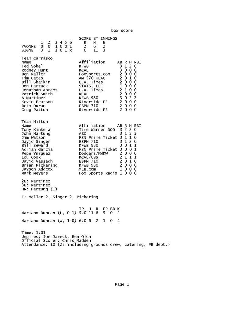 A Martinez of KFWB had the only other extra-base hits besides Hartung, as he doubled and tripled. He was even used as a bogus pinch-hitter by Yvonne in the bottom half of the sixth to try and get her team back in the game, but the rally fell short in the end.