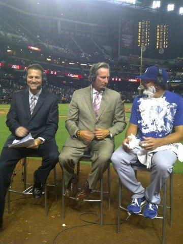 With Nathan already in the clubhouse late in the game, I had to go downstairs in the top of the ninth to see if we could coax him out on the field postgame for a live interview with PRIME Ticket. Of course, you don’t want to jinx anything by saying, “Hey, if we win can you go out on the field?” and yet you have to still do it or you miss a big opportunity.